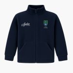 Prenda superior de polar azul marino antipeeling. Cuenta con cierre frontal, cuello alto para mayor abrigo, bolsillos laterales y escudo bordado en frente y espalda. (Composición: 65% poliéster, 35% algodón)
